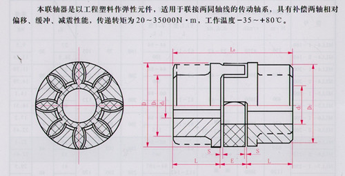 本聯軸器是以工程塑料作彈性元件,適用于聯接兩同軸線的傳動軸系,具有補償兩軸相對偏移、緩沖、減震性能,傳遞轉矩為20——35000N.m,工作溫度-35_+80℃